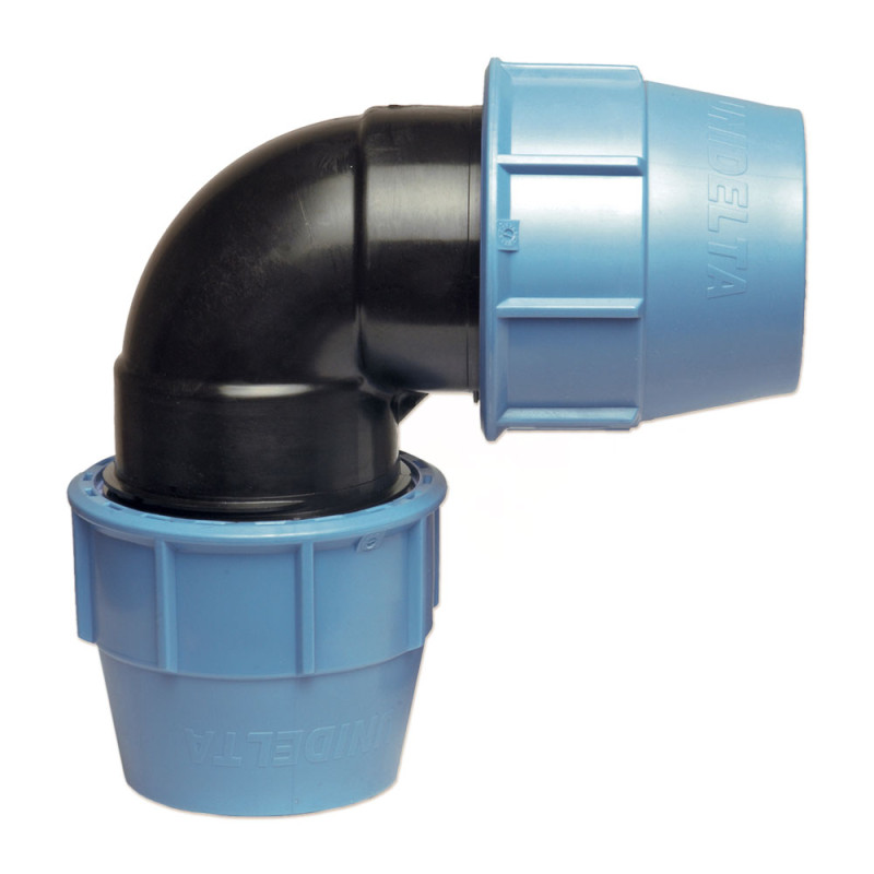 фітинги компресійні кутові 90° з'єднувальні для поліпропіленової труби забезпечують досконалу гідравлічну герметизацію в системах розподілу води під тиском. З`єднувальна система складається з приєднання поліетиленової труби затискним кільцем, що охоплює та фіксує трубу після того, як блакитна гайка буде затягнута. Технічні характеристики компресійних фітингів Unidelta роблять їх надзвичайно швидкими і легкими в монтажі. Діапазон діаметрів — від 16 мм до 110 мм (16 бар номінальний тиск). Основні компоненти компресійних фітингів Unidelta виготовлені з наступних матеріалів: корпус, втулка та гайка — надміцний поліпропілен (PP-B) з УФ захистом; ущільнення — нітрилова гума (NBR); затискне кільце — ацеталова смола (POM).