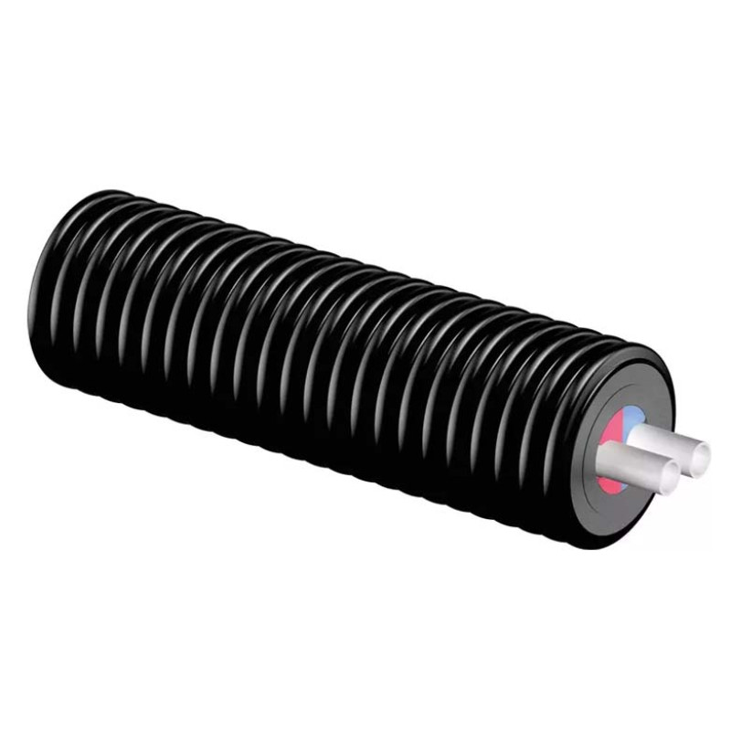 Труба Uponor Ecoflex Varia Twin гнучка попередньо ізольована полімерна труба в бухті для систем теплопостачання. Включає 2 труби РЕ-Ха, серія S5,0 з антидифузійним шаром EVOH. Теплоізоляція багатошарова, стійка до старіння, еластична, виконана зі спіненого зшитого поліетилену PE-X з закритими порами (водопоглинання 1%). Захисний гофрований кожух виготовляється з поліетилену високої щільності HDPE. Дозволяється установка на ділянках з інтенсивним транспортним рухом SLW 60 (вантажні автомобілі до 60 тон). Термін служби 50 років при температурних режимах системи опалення: