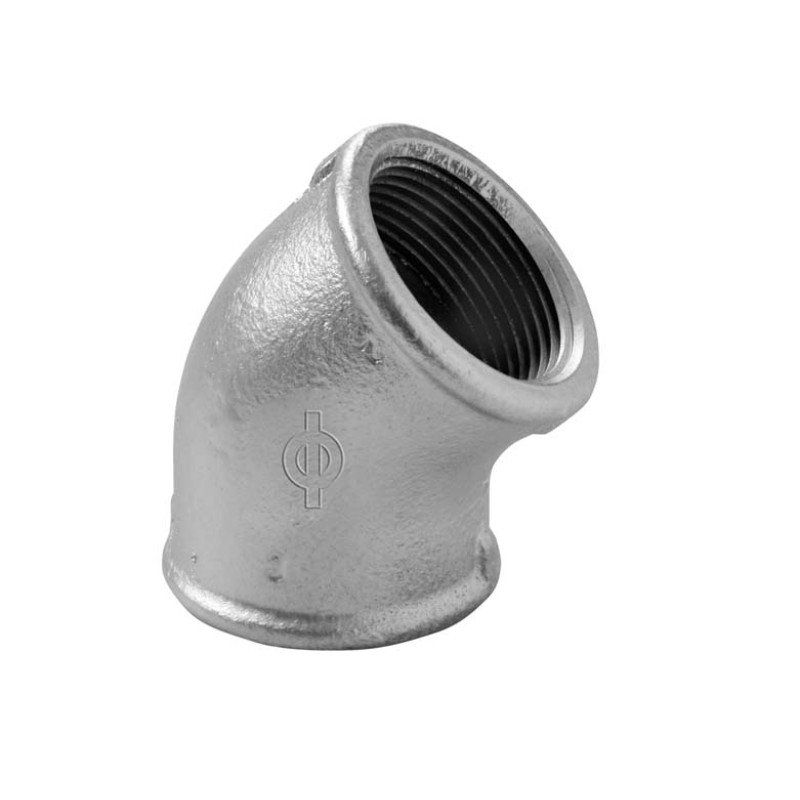 фітинги чавунні оцинковані різьбові кутові 45° внутрішня-внутрішня різьба згідно з EN 10242 проходять закалювання при 1060 ˚C, має гаряче цинкування з товщиною захисного шару 70 мкм (маса покриття 500 г/м²). З'єднувальна різьба відповідає EN-10226-1 тип R-Rp, а кріпильна різьба на гайках та їх сполучення розраховано на відповідність стандарту EN ISO 228-1. Фітинги підходять для сталевих труб, згідно з EN 10255 від 1/8 до 6 дюймів для використання у системах опалення, охолодження, кондиціонування та вентиляції, систем поливу, санітарного водопостачання холодної та гарячої води, установках пожежогасіння, а також трубопродів стисненого повітря.
