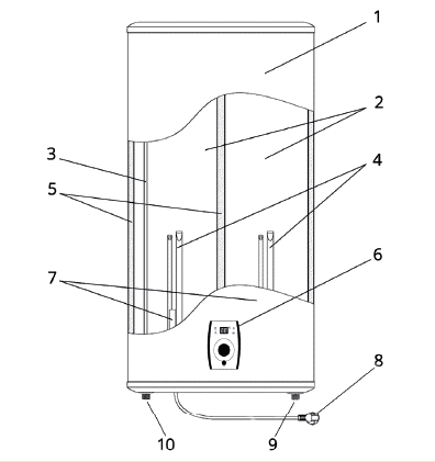4. Нагревательные элементы в специальных защитных кожухах (в каждом внутреннем баке) 5. Слой теплоизоляционного материала - пенополиуретана высокой плотности 6. Панель управления 7. Защитные магниевые аноды (в каждом внутреннем баке) 8. Шнур питания 9. Вход холодной воды 10. Выход горячей воды.