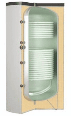 Изоляция для водонагревателей косвенного нагрева, объемом до 500 л выполнена из слоя жесткого, вспененного пенополиуретана толщиной 50 мм, теплопроводность - 0,23 Вт/мК.