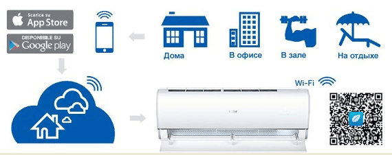 - WI-FI опция. Для более удобного контроля за работой сплит-системы предусмотрена функция удаленного управления через Wi-Fi. Вы сможете задавать температуру, время работы или режимы работы кондиционера с помощью планшета, смартфона или компьютера.