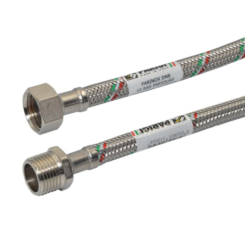 Гнучкі шланги Parigi Parinox® застосовуються для монтажу сантехнічних установок і водопровідного обладнання. Шланги Parinox, виконані з нетоксичного гуми (EPDM) і мають оплітку з нержавіючої сталевого дроту. Шланги Parinox DN8 довжиною від 200 до 2 000 мм, з екслюзівним кольоровим плетінням в кольорах національного прапора Італії. Кінці шлангів забезпечені сполучними фітингами з різними розмірами штуцерів і накидних гайок — ½", ⅜", MOK, MOM. На шланги Parinox® діє заводська гарантія — 10 років. Надійність шланга і підводки забезпечується ще й тим, що всі сполучні деталі виконані з нержавіючої сталі, а латунні гайки мають достатню висоту і товщину стінок. Продукція Рarigi пройшла сертифікацію в Україні.