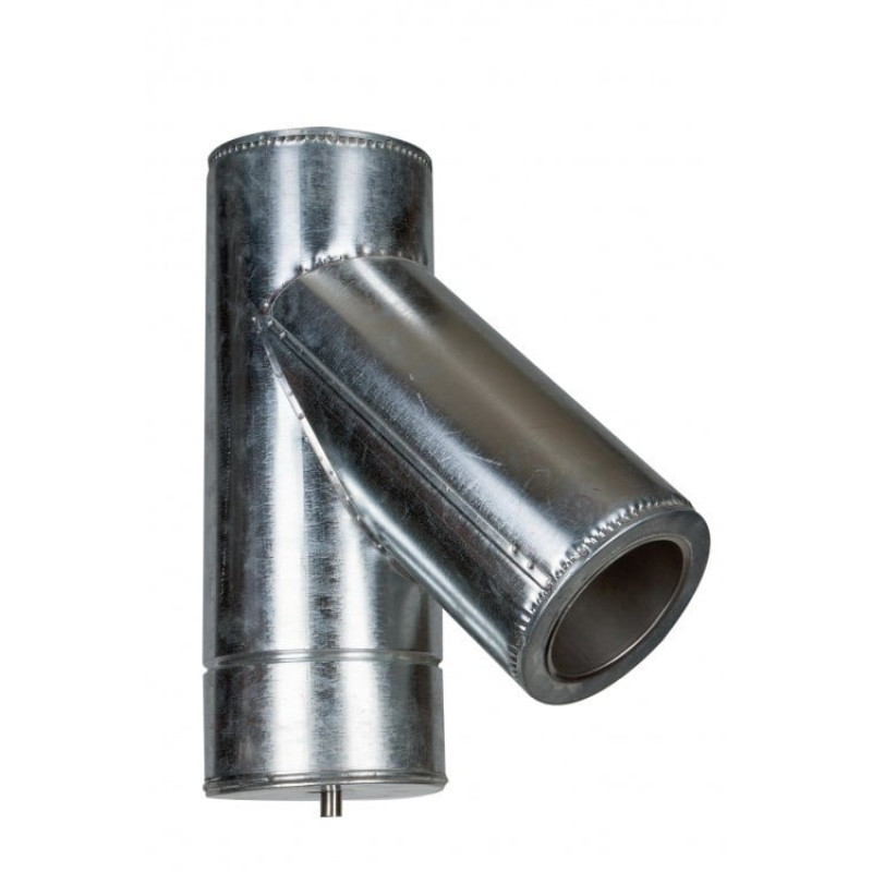 Тройник 45° из нержавеющей стали, тип "Сэндвич" – это элемент дымоходной системы, предназначенный для разделения потока дымовых газов на два или три направления. Используется для подключения к дымоходу отопительных приборов, каминов, печей, банных печей, а также для ревизии и чистки дымового канала.
