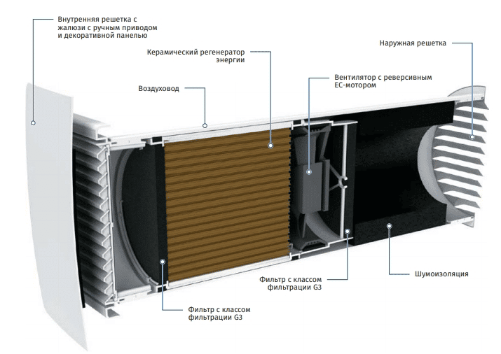 Рекуператор складається з наступних конструктивних вузлів: картриджа, кімнатної захисної решітки з декоративною накладкою, повітровода з шумоізолятором, зовнішньої захисної сітки або ковпака (опція). Основним функціональним вузлом є картридж, що складається з вентилятора з енергозберігаючим ЄС-двигуном, фільтрів класу G3, які фільтрують повітря, що надходить, не пропускаючи великі частинки пилу і керамічного акумулятора тепла (регенератора). При технічному обслуговуванні фільтри вільно виймаються з катриджу. Опціонально передбачено встановлення фільтра класу F8, завдяки якому повітряний потік на 99% очищається від забруднюючих частинок. У кімнатному блоці передбачені жалюзі, які при вимкненні пристрою закриваються вручну та зовнішній потік повітря не потрапляє до приміщення.