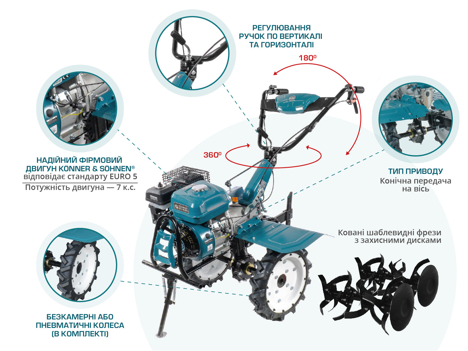 Базово ви отримуєте сам культиватор з фрезами і кермом. Корисні доповнення: захисні диски, додаткові секції фрез, сошник, транспортні колеса, мірна каністра для пального, подовжувач із захистом для електромоделей. Для бренду Konner & Sohnen доступні сумісні аксесуари та запчастини.