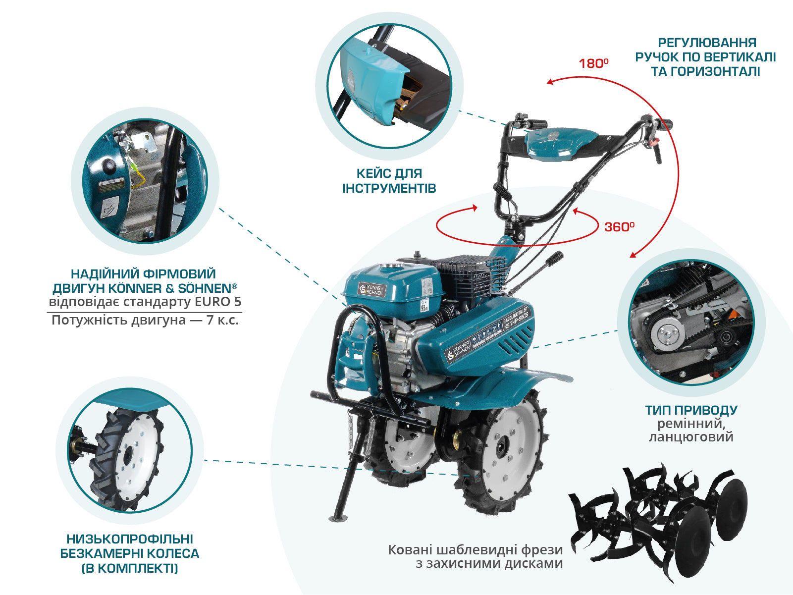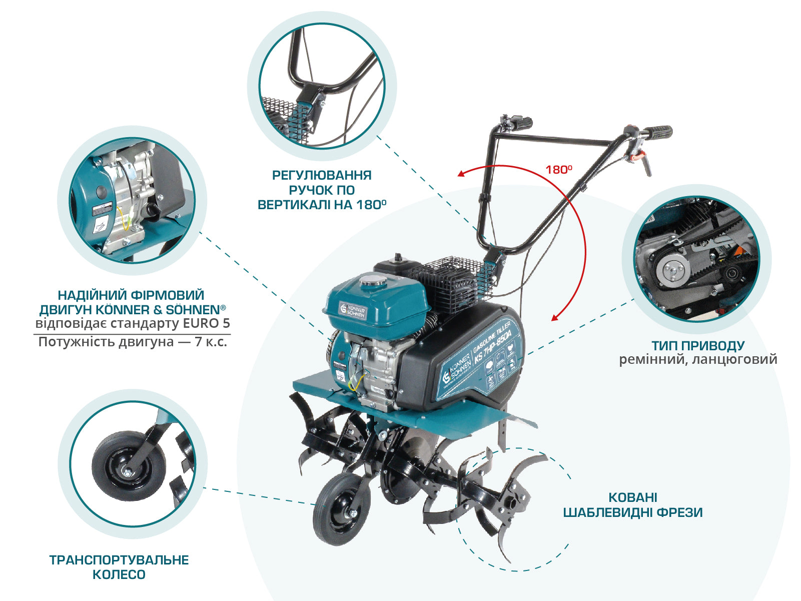 Якщо у вас цілина, важкий чорнозем або великі площі, зверніть увагу на бензиновий культиватор. Бензинові моделі потужніші, мають більшу ширину обробітку, глибше заходять у ґрунт і спокійно працюють там, де електриці дістатися складно. Двигун внутрішнього згоряння забезпечує автономність, стабільний крутний момент і продуктивність, якої вистачає і на підготовку ділянки під посадку, і на сезонне внесення добрив. У лінійці Könner & Söhnen доступні варіанти з реверсом, транспортними колесами та регулюванням керма під зріст оператора.