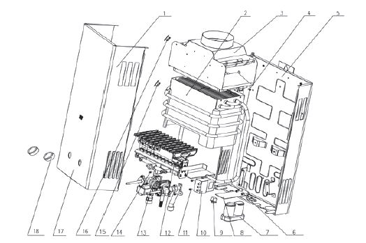 13 - латунний гідравлічний блок із газовим клапаном; 14 - шуруп; 15 - запобіжний термостат; 16 – датчик температури димових газів; 17 - електронний дисплей 18 - регулятори температури та витрати води.